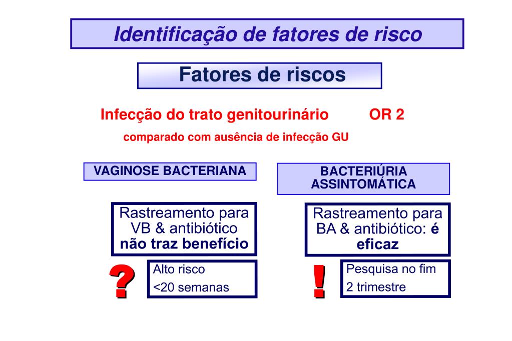 Identificação de fatores de risco Fatores de riscos • Infecção do trato genitourinário OR 2 • comparado com ausência de infecção GU VAGINOSE BACTERIANA BACTERIÚRIA ASSINTOMÁTICA Rastreamento para VB & antibiótico não traz benefício Rastreamento para BA & antibiótico: é eficaz ? ! Pesquisa no fim 2 trimestre Alto risco <20 semanas