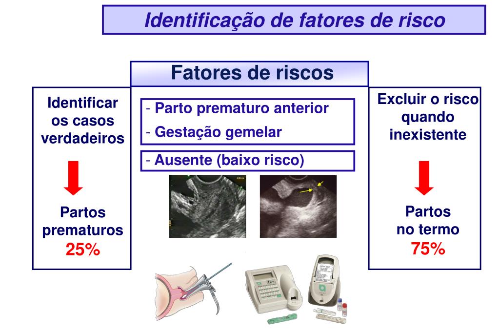 Identificação de fatores de risco Fatores de riscos Excluir o risco quando inexistente Partos no termo 75% Identificar os casos verdadeiros Partos prematuros 25% • Parto prematuro anterior • Gestação gemelar • Ausente (baixo risco)