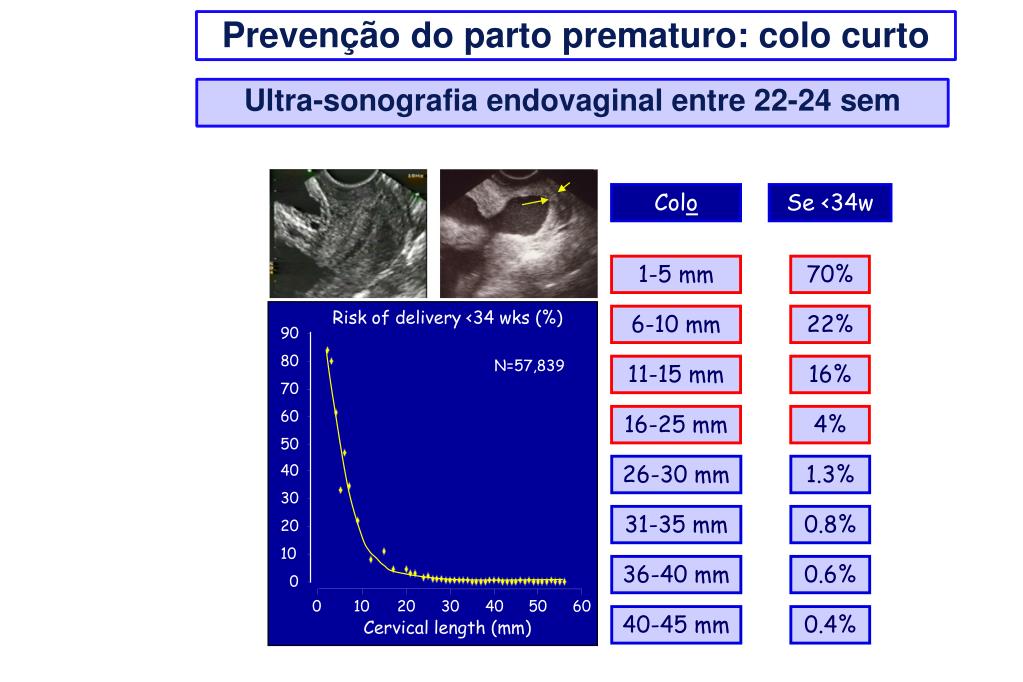 Prevenção do parto prematuro: colo curto Ultra-sonografia endovaginal entre 22-24 sem Colo Se <34w 1-5 mm 70% 6-10 mm 22% Risk of delivery <34 wks (%) 11-15 mm 16% 90 80 N=57,839 16-25 mm 4% 70 60 26-30 mm 1.3% 50 31-35 mm 0.8% 40 30 36-40 mm 0.6% 20 10 40-45 mm 0.4% 0 0 10 20 30 40 50 60 Cervical length (mm)