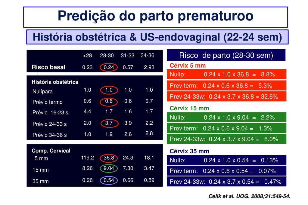 Predição do parto prematuroo Risco de parto (28-30 sem) <28 31-33 28-30 34-36 Cérvix 5 mm 0.23 0.24 0.57 2.93 Nulíp: 0.24 x 1.0 x 36.8 = 8.8% Prev term: 0.24 x 0.6 x 36.8 = 5.3% Prev 24-33w: 0.24 x 3.7 x 36.8 = 32.6% Cérvix 15 mm Nulíp: 0.24 x 1.0 x 9.04 = 2.2% Prev term: 0.24 x 0.6 x 9.04 = 1.3% Prévio 34-36 s 1.0 1.9 2.6 2.8 Prev 24-33w: 0.24 x 3.7 x 9.04 = 8.0% Comp. Cervical Cérvix 35 mm 5 mm 119.2 36.8 24.3 Nulíp: 0.24 x 1.0 x 0.54 = 0.13% 18.1 8.26 9.04 7.30 15 mm Prev term: 0.24 x 0.6 x 0.54 = 0.07% 3.47 História obstétrica 35 mm 0.26 0.54 0.66 Prev 24-33w: 0.24 x 3.7 x 0.54 = 0.47% 0.89 1.0 1.0 1.0 Nulípara 1.0 Prévio termo 0.6 0.6 0.6 0.7 Prévio 16-23 s 4.4 1.7 1.6 1.7 Prévio 24-33 s 2.0 3.7 3.9 2.2 História obstétrica & US-endovaginal (22-24 sem) Risco basal Celiket al. UOG. 2008;31:549-54.