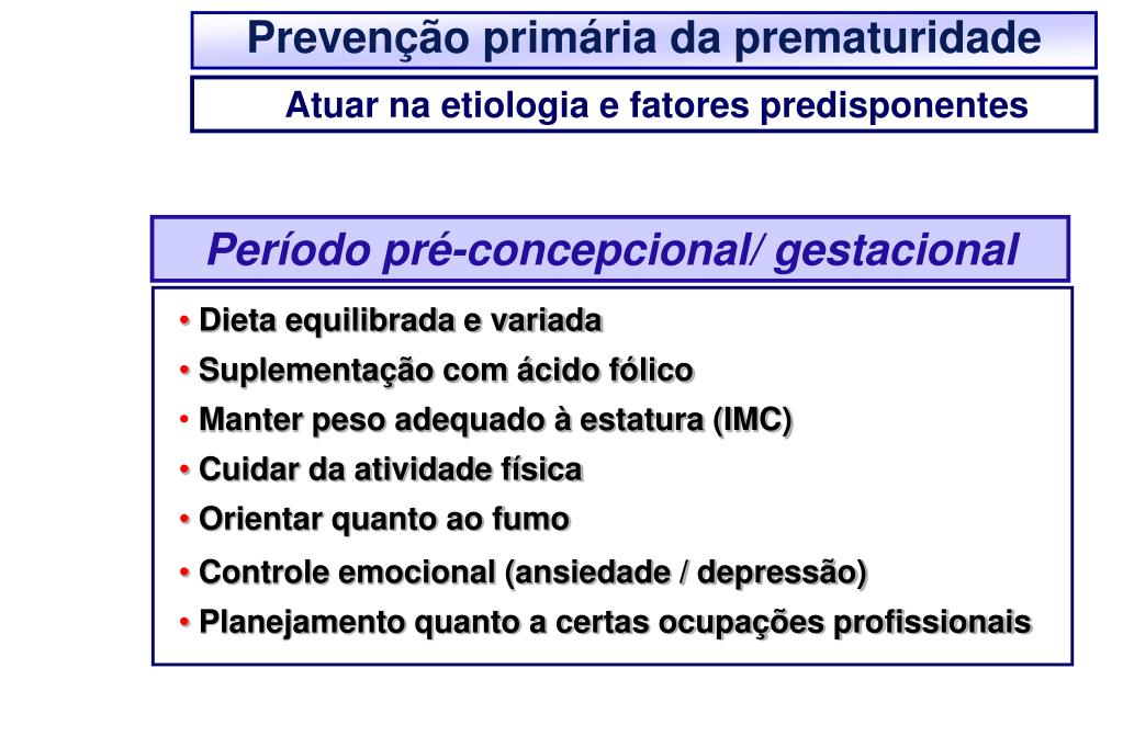 Prevenção primária da prematuridade Atuar na etiologia e fatores predisponentes Período pré-concepcional/ gestacional • Dieta equilibrada e variada • Suplementação com ácido fólico • Manter peso adequado à estatura (IMC) • Cuidar da atividade física • Orientar quanto ao fumo • Controle emocional (ansiedade / depressão) • Planejamento quanto a certas ocupações profissionais