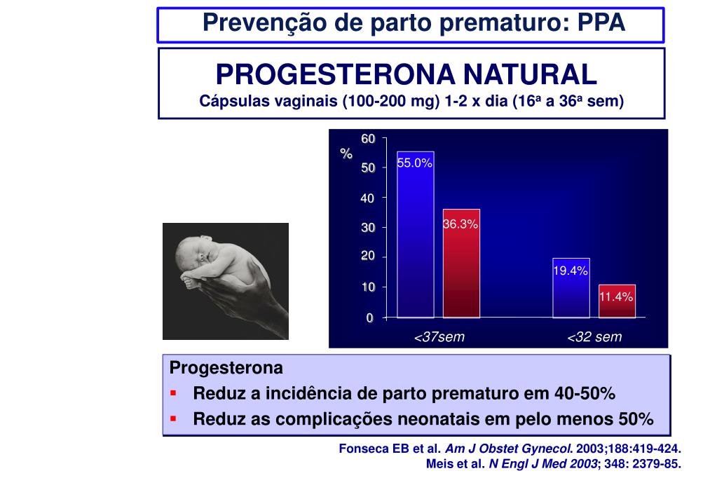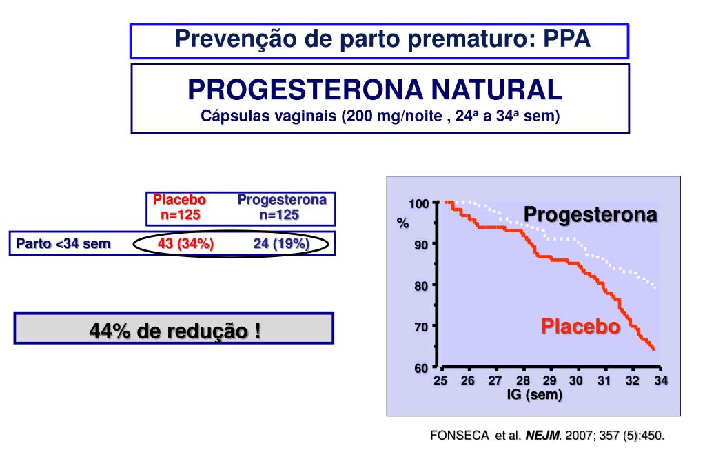 Prevenção de parto prematuro: PPA PROGESTERONA NATURAL Cápsulas vaginais (200 mg/noite , 24a a 34a sem) Placebo Progesterona n=125 n=125 Parto <34 sem43 (34%) 24 (19%) 100 Progesterona % 90 44% de redução ! 80 Placebo 70 60 25 26 27 28 29 30 31 32 34 IG (sem) FONSECA et al. NEJM. 2007; 357 (5):450.