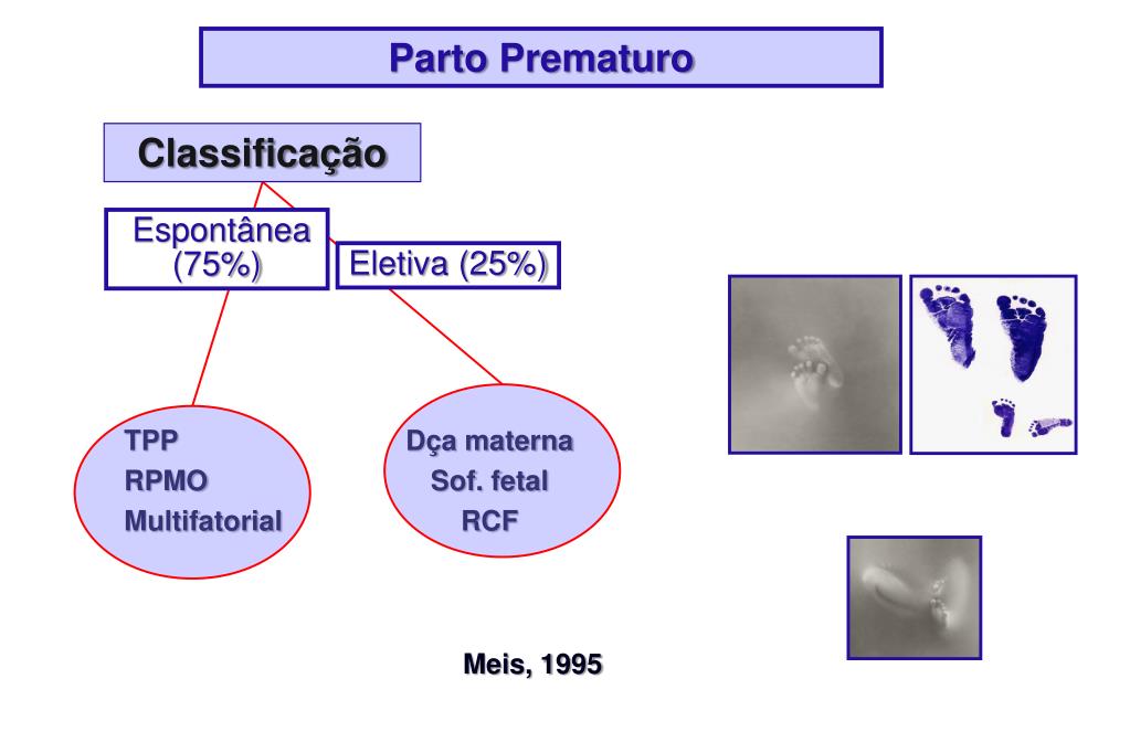 Classificação Espontânea (75%) Eletiva (25%) TPP RPMO Multifatorial Dça materna Sof. fetal RCF PartoPrematuro Meis, 1995