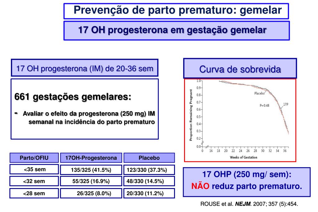 Prevenção de parto prematuro: gemelar 661 gestaçõesgemelares: - Avaliar o efeitodaprogesterona (250 mg) IM semanalnaincidência do partoprematuro 17 OH progesteronaemgestação gemelar Curva de sobrevida 17 OH progesterona (IM) de 20-36 sem Parto/OFIU 17OH-Progesterona Placebo <35 sem 135/325 (41.5%) 123/330 (37.3%) 17 OHP (250 mg/ sem): NÃO reduz parto prematuro. <32 sem 55/325 (16.9%) 48/330 (14.5%) <28 sem 26/325 (8.0%) 20/330 (11.2%) ROUSE et al. NEJM. 2007; 357 (5):454.