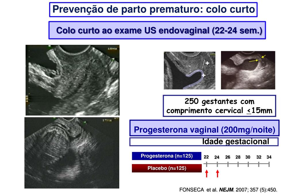 Prevenção de parto prematuro: colo curto + + 26 28 30 32 34 24 22 2 4 6 8 10 20 ColocurtoaoexameUS endovaginal (22-24 sem.) 250 gestantes com comprimento cervical <15mm Progesterona vaginal (200mg/noite) Idadegestacional Progesterona (n=125) Placebo (n=125) FONSECA et al. NEJM. 2007; 357 (5):450.