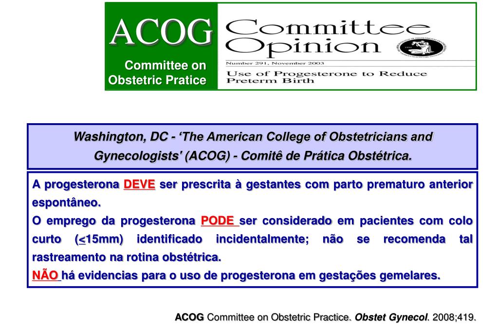 ACOG Committee on Obstetric Pratice Washington, DC - ‘The American College of Obstetricians and Gynecologists' (ACOG) - Comitê de Prática Obstétrica. A progesterona DEVE ser prescrita à gestantes com parto prematuro anterior espontâneo. O emprego da progesterona PODE ser considerado em pacientes com colo curto (<15mm) identificado incidentalmente; não se recomenda tal rastreamento na rotina obstétrica. NÃOhá evidencias para o uso de progesterona em gestações gemelares. ACOG Committee on Obstetric Practice. Obstet Gynecol. 2008;419.