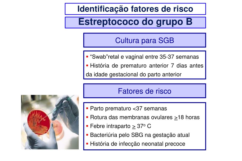 Identificação fatores de risco Estreptococo do grupo B Cultura para SGB • “Swab”retal e vaginal entre 35-37 semanas • História de prematuro anterior 7 dias antes da idade gestacional do parto anterior Fatores de risco • Parto prematuro <37 semanas • Rotura das membranas ovulares >18 horas • Febre intraparto > 37o C • Bacteriúria pelo SBG na gestação atual • História de infecção neonatal precoce