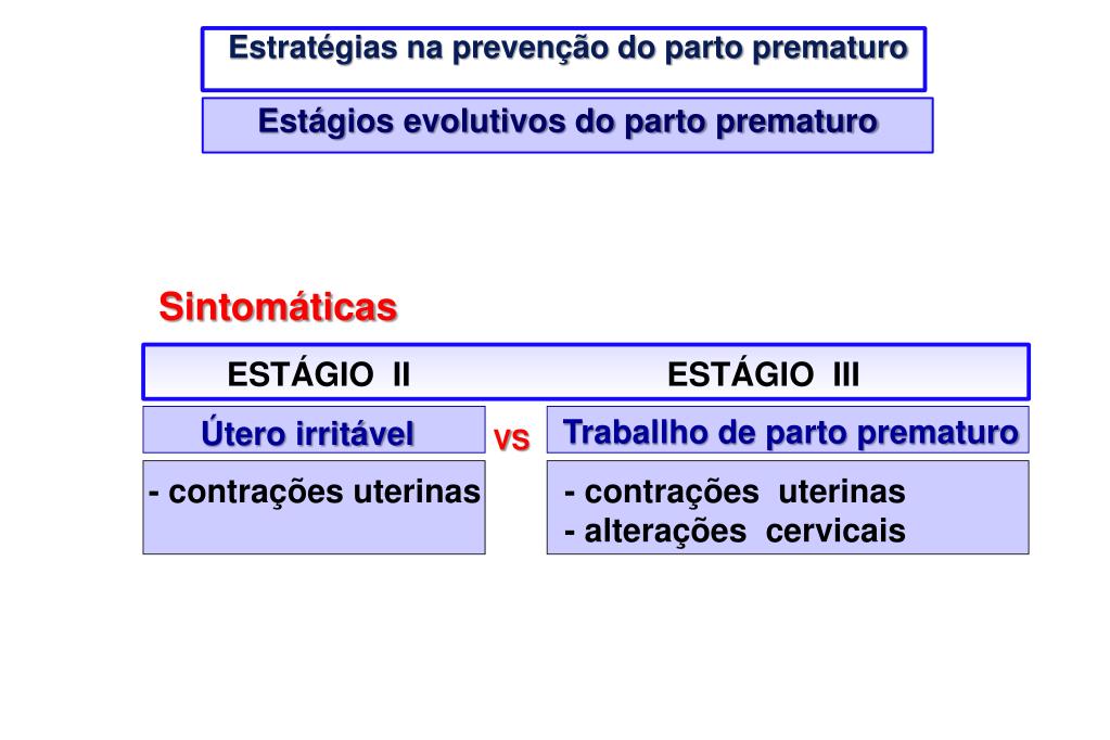 Estratégias na prevenção do parto prematuro Estágios evolutivos do parto prematuro Sintomáticas ESTÁGIO III ESTÁGIO II Traballho de parto prematuro Útero irritável VS - contrações uterinas - contrações uterinas - alterações cervicais