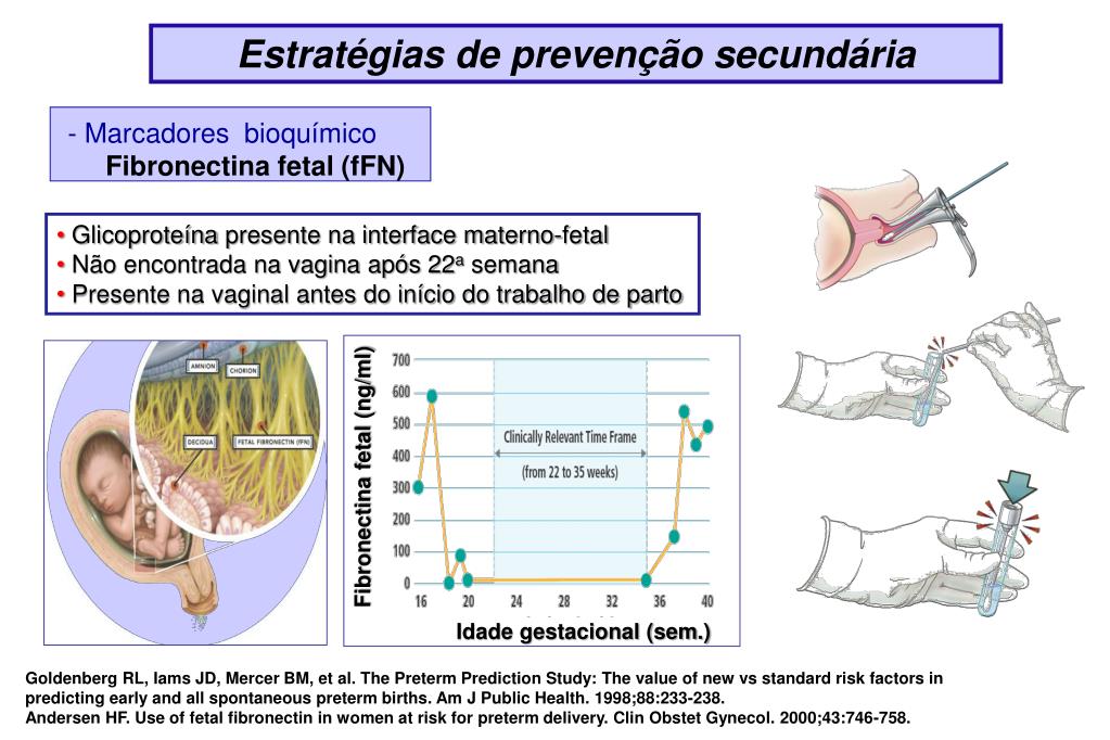 Estratégias de prevençãosecundária - Marcadores bioquímico Fibronectina fetal (fFN) • Glicoproteína presente na interface materno-fetal • Não encontrada na vagina após 22a semana • Presente na vaginal antes do início do trabalho de parto Fibronectina fetal (ng/ml) Idade gestacional (sem.) Goldenberg RL, Iams JD, Mercer BM, et al. The Preterm Prediction Study: The value of new vs standard risk factors in predicting early and all spontaneous preterm births. Am J Public Health. 1998;88:233-238. Andersen HF. Use of fetal fibronectin in women at risk for preterm delivery. Clin Obstet Gynecol. 2000;43:746-758.