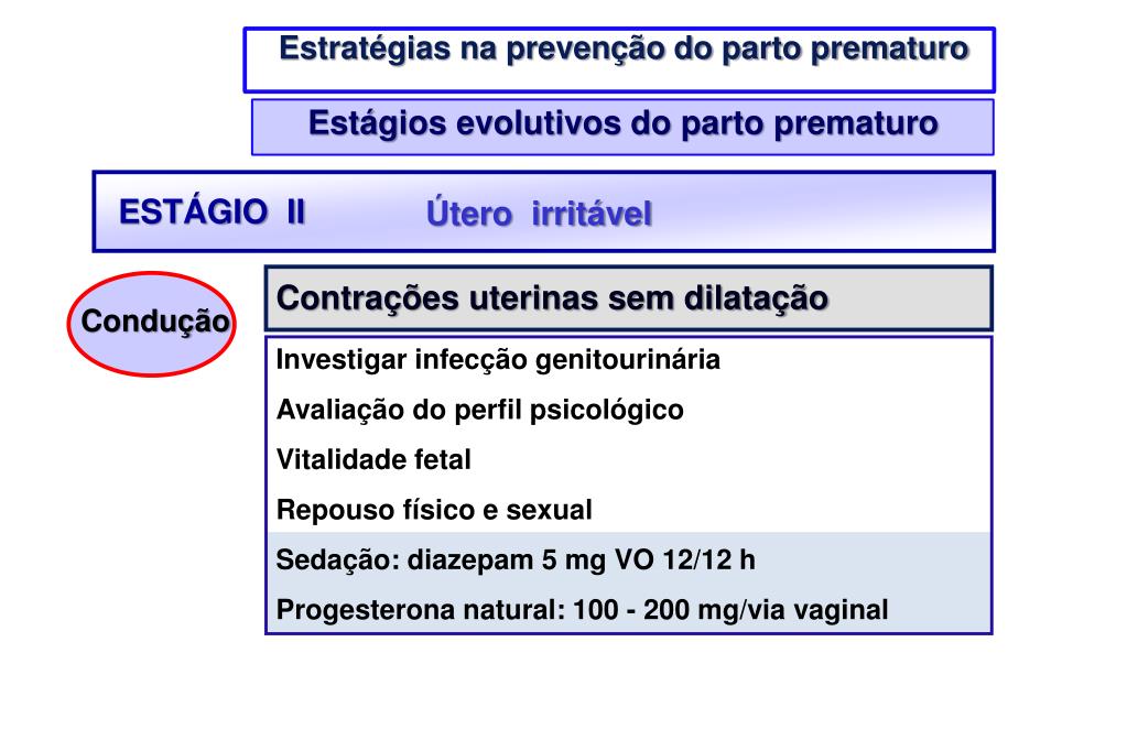Estratégias na prevenção do parto prematuro Estágios evolutivos do parto prematuro ESTÁGIO II Útero irritável Contrações uterinas sem dilatação Condução Investigar infecção genitourinária Avaliação do perfil psicológico Vitalidade fetal Repouso físico e sexual Sedação: diazepam 5 mg VO 12/12 h Progesterona natural: 100 - 200 mg/via vaginal