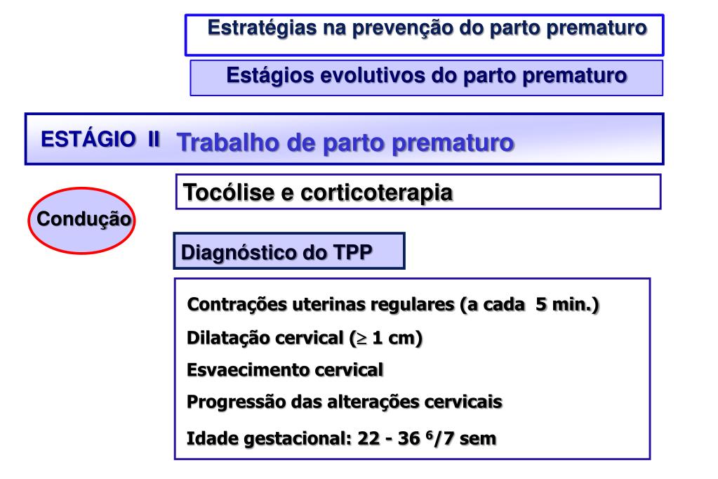 Estratégias na prevenção do parto prematuro Estágios evolutivos do parto prematuro Trabalho de parto prematuro ESTÁGIO II Tocólise e corticoterapia Condução Diagnóstico do TPP Contrações uterinas regulares (a cada 5 min.) Dilatação cervical ( 1 cm) Esvaecimento cervical Progressão das alterações cervicais Idade gestacional: 22 - 36 6/7 sem