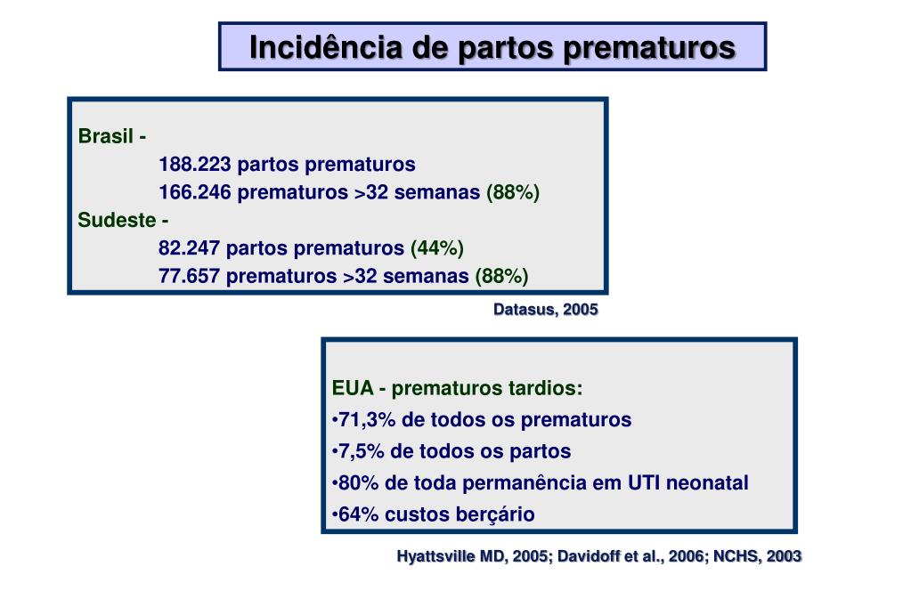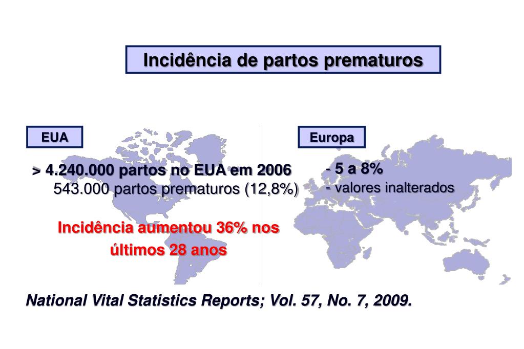 Incidência de partos prematuros EUA Europa • 5 a 8% • valores inalterados > 4.240.000 partos no EUA em 2006 543.000 partos prematuros (12,8%) Incidência aumentou 36% nos últimos 28 anos National Vital Statistics Reports; Vol. 57, No. 7, 2009.