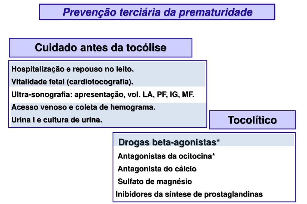 Prevenção terciária da prematuridade Cuidado antes da tocólise Hospitalização e repouso no leito. Vitalidade fetal (cardiotocografia). Ultra-sonografia: apresentação, vol. LA, PF, IG, MF. Acesso venoso e coleta de hemograma. Urina I e cultura de urina. Tocolítico Drogas beta-agonistas* Antagonistas da ocitocina* Antagonista do cálcio Sulfato de magnésio Inibidores da síntese de prostaglandinas
