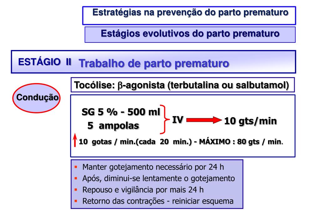 Estratégias na prevenção do parto prematuro Estágios evolutivos do parto prematuro Trabalho de parto prematuro ESTÁGIO II Tocólise: b-agonista (terbutalina ou salbutamol) Condução SG 5 % - 500 ml 5 ampolas IV 10 gts/min 10 gotas / min.(cada 20 min.) - MÁXIMO : 80 gts / min. • Manter gotejamento necessário por 24 h • Após, diminui-se lentamente o gotejamento • Repouso e vigilância por mais 24 h • Retorno das contrações - reiniciar esquema