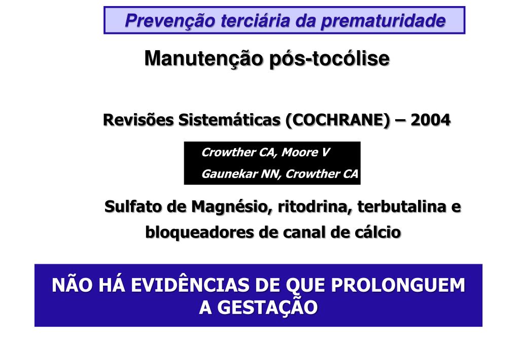 Prevenção terciária da prematuridade Manutenção pós-tocólise • Revisões Sistemáticas (COCHRANE) – 2004 • Crowther CA, Moore V • Gaunekar NN, Crowther CA • Sulfato de Magnésio, ritodrina, terbutalina e bloqueadores de canal de cálcio NÃO HÁ EVIDÊNCIAS DE QUE PROLONGUEM A GESTAÇÃO