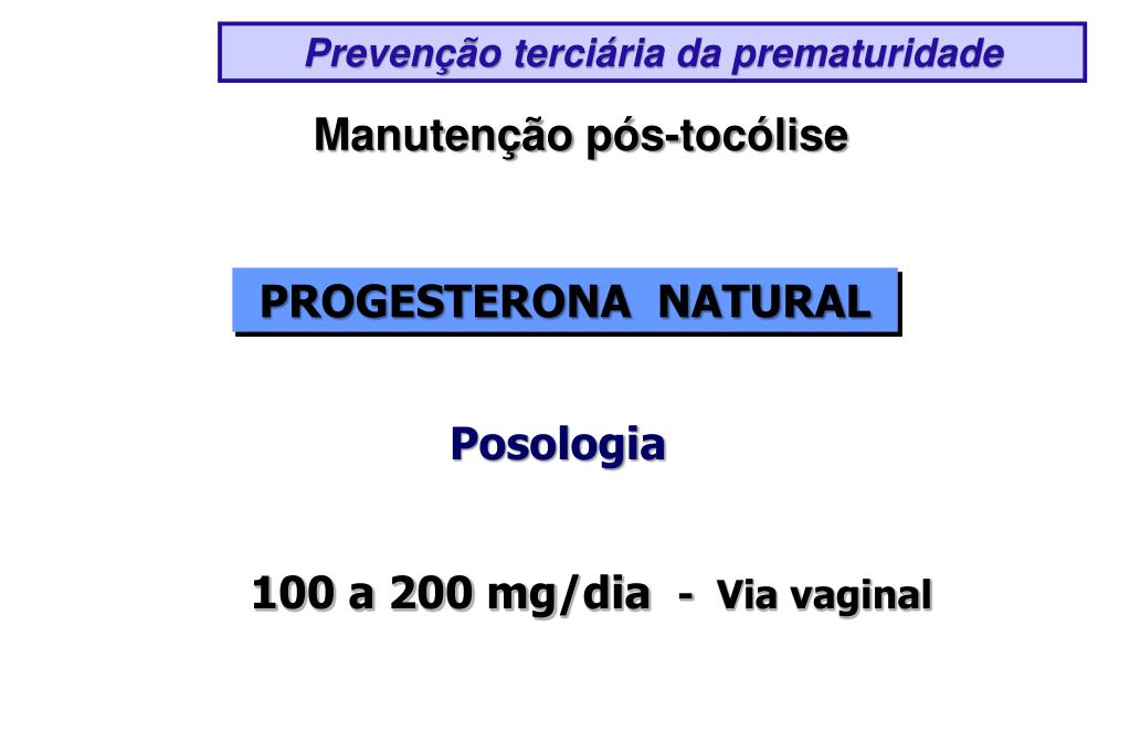 Prevenção terciária da prematuridade Manutenção pós-tocólise PROGESTERONA NATURAL Posologia 100 a 200 mg/dia - Via vaginal