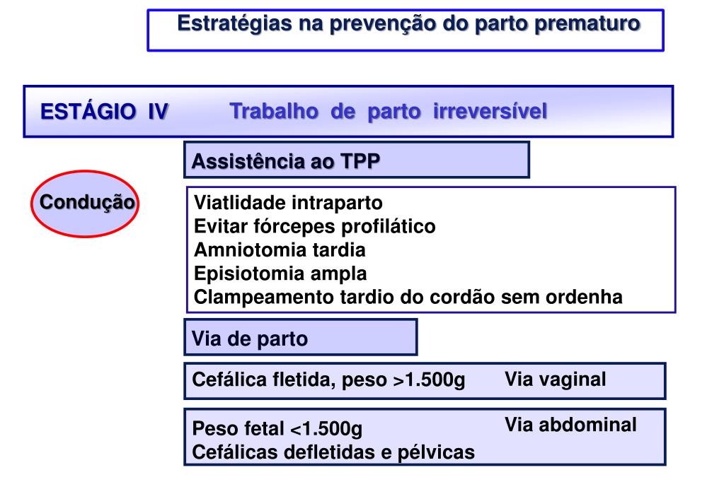 Estratégias na prevenção do parto prematuro Trabalho de parto irreversível ESTÁGIO IV Assistência ao TPP Condução Viatlidade intraparto Evitar fórcepes profilático Amniotomia tardia Episiotomia ampla Clampeamento tardio do cordão sem ordenha Via de parto Via vaginal Cefálica fletida, peso >1.500g Via abdominal Peso fetal <1.500g Cefálicas defletidas e pélvicas