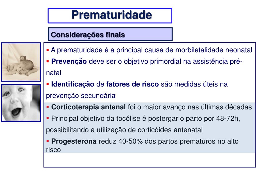 Prematuridade Considerações finais • A prematuridade é a principal causa de morbiletalidade neonatal • Prevenção deve ser o objetivo primordial na assistência pré-natal • Identificação de fatores de risco são medidas úteis na prevenção secundária • Corticoterapiaantenalfoi o maior avanço nas últimas décadas • Principal objetivo da tocólise é postergar o parto por 48-72h, possibilitando a utilização de corticóides antenatal • Progesterona reduz 40-50% dos partos prematuros no alto risco