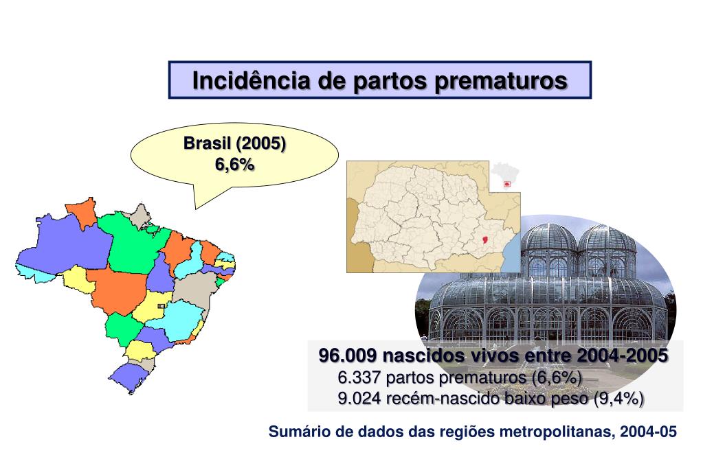 Incidência de partos prematuros Brasil (2005) 6,6% 96.009 nascidos vivos entre 2004-2005 6.337 partos prematuros (6,6%) 9.024 recém-nascido baixo peso (9,4%) Sumário de dados das regiões metropolitanas, 2004-05