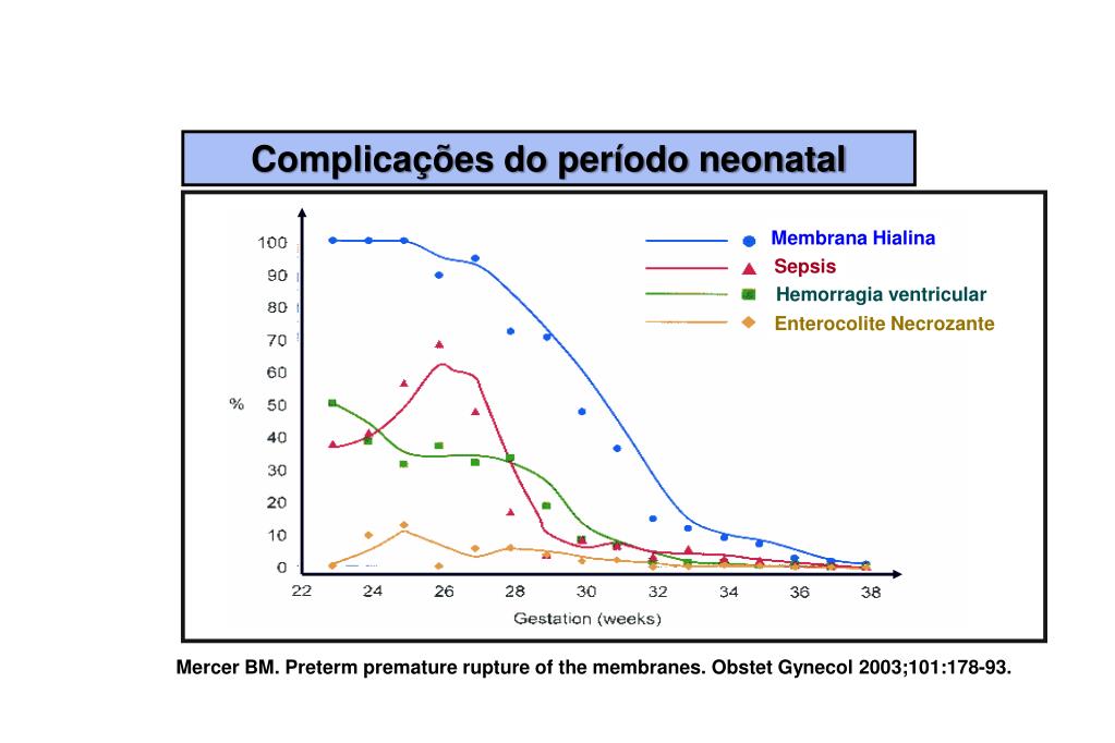 Complicações do período neonatal Membrana Hialina Sepsis Hemorragia ventricular EnterocoliteNecrozante Mercer BM. Preterm premature rupture of the membranes. ObstetGynecol 2003;101:178-93.