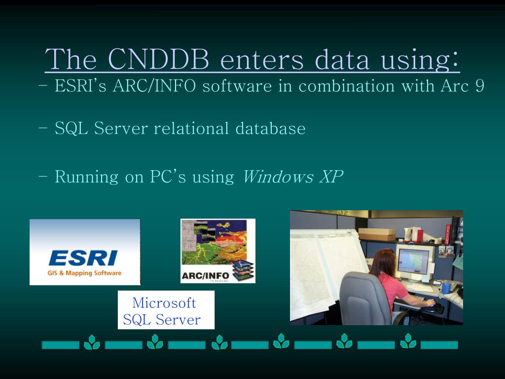The CNDDB enters data using: • ESRI’s ARC/INFO software in combination with Arc 9 • SQL Server relational database • Running on PC’s using WindowsXP Microsoft SQL Server