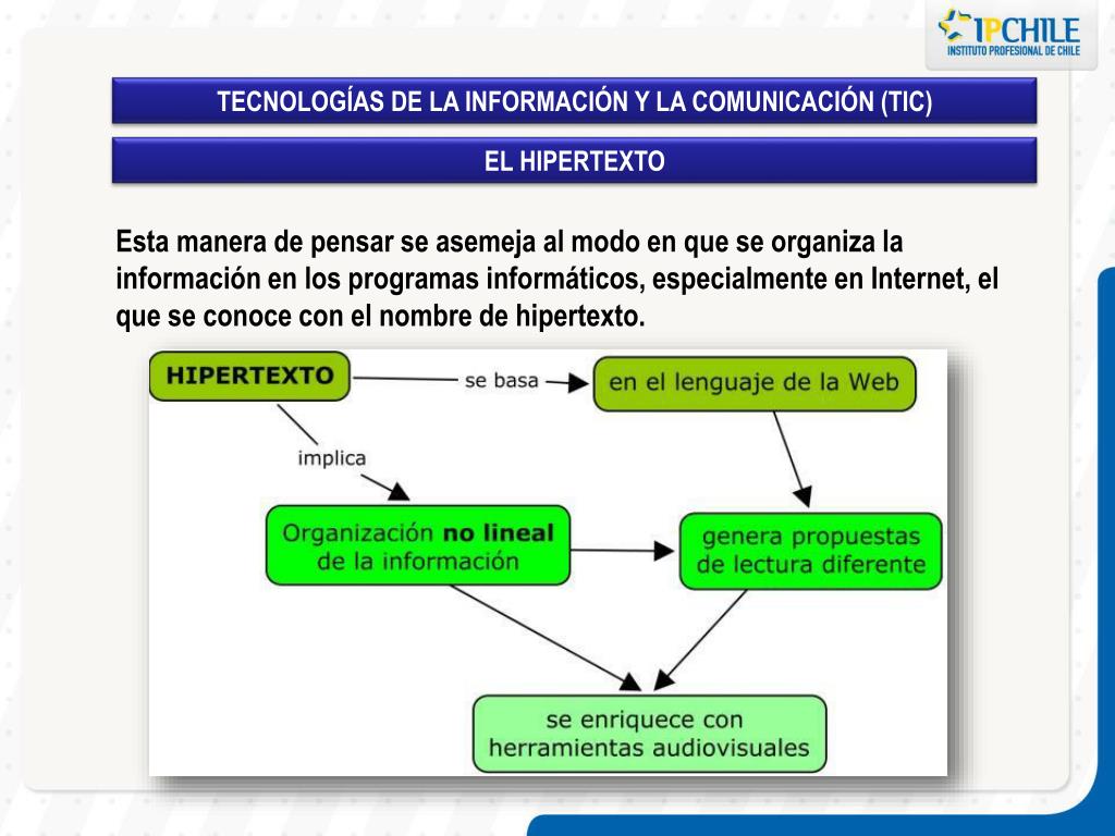 TECNOLOGÍAS DE LA INFORMACIÓN Y LA COMUNICACIÓN (TIC) EL HIPERTEXTO Esta manera de pensar se asemeja al modo en que se organiza la información en los programas informáticos, especialmente en Internet, el que se conoce con el nombre de hipertexto.