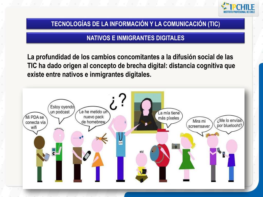 TECNOLOGÍAS DE LA INFORMACIÓN Y LA COMUNICACIÓN (TIC) NATIVOS E INMIGRANTES DIGITALES La profundidad de los cambios concomitantes a la difusión social de las TIC ha dado origen al concepto de brecha digital: distancia cognitiva que existe entre nativos e inmigrantes digitales.