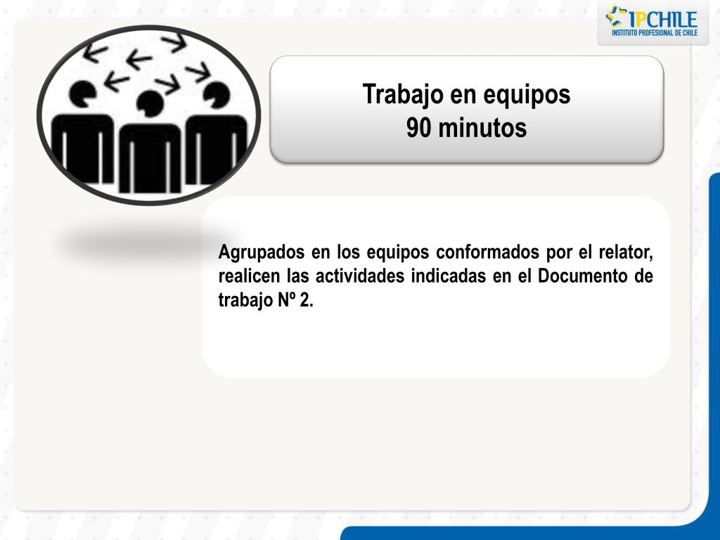 Trabajo en equipos 90 minutos Agrupados en los equipos conformados por el relator, realicen las actividades indicadas en el Documento de trabajo Nº 2.