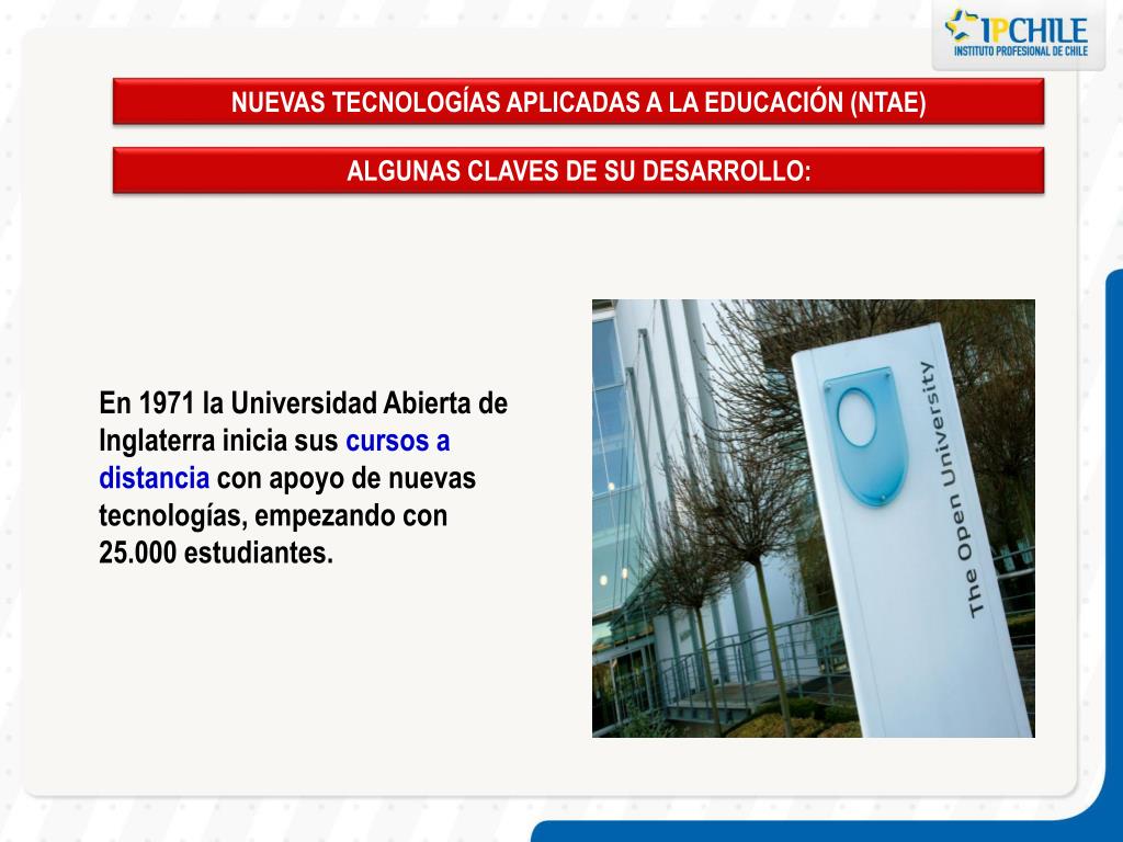 NUEVAS TECNOLOGÍAS APLICADAS A LA EDUCACIÓN (NTAE) ALGUNAS CLAVES DE SU DESARROLLO: En 1971 la Universidad Abierta de Inglaterra inicia sus cursos a distancia con apoyo de nuevas tecnologías, empezando con 25.000 estudiantes.