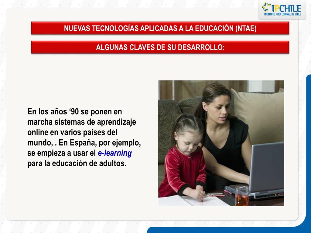 NUEVAS TECNOLOGÍAS APLICADAS A LA EDUCACIÓN (NTAE) ALGUNAS CLAVES DE SU DESARROLLO: En los años ‘90 se ponen en marcha sistemas de aprendizaje online en varios países del mundo, . En España, por ejemplo, se empieza a usar el e-learning para la educación de adultos.