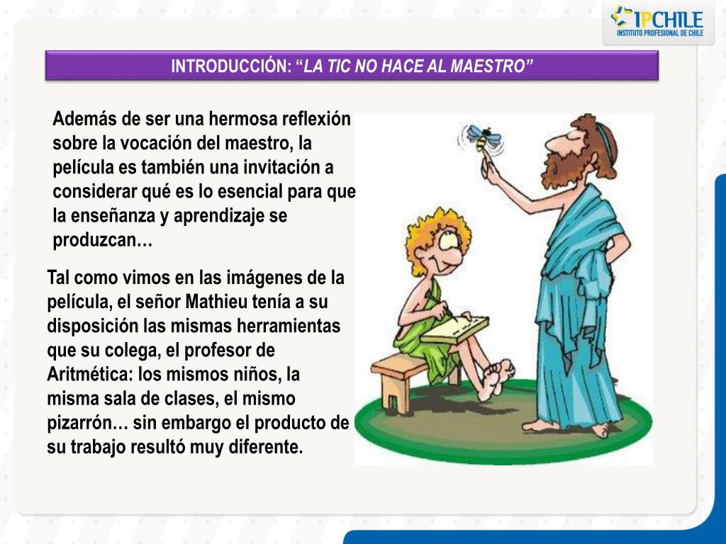 INTRODUCCIÓN: “LA TIC NO HACE AL MAESTRO” Además de ser una hermosa reflexión sobre la vocación del maestro, la película es también una invitación a considerar qué es lo esencial para que la enseñanza y aprendizaje se produzcan… Tal como vimos en las imágenes de la película, el señor Mathieu tenía a su disposición las mismas herramientas que su colega, el profesor de Aritmética: los mismos niños, la misma sala de clases, el mismo pizarrón… sin embargo el producto de su trabajo resultó muy diferente.