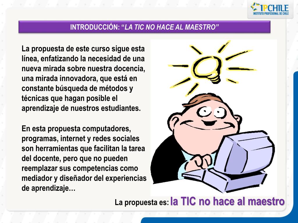 INTRODUCCIÓN: “LA TIC NO HACE AL MAESTRO” La propuesta de este curso sigue esta línea, enfatizando la necesidad de una nueva mirada sobre nuestra docencia, una mirada innovadora, que está en constante búsqueda de métodos y técnicas que hagan posible el aprendizaje de nuestros estudiantes. En esta propuesta computadores, programas, internet y redes sociales son herramientas que facilitan la tarea del docente, pero que no pueden reemplazar sus competencias como mediador y diseñador del experiencias de aprendizaje… La propuesta es:la TIC no hace al maestro
