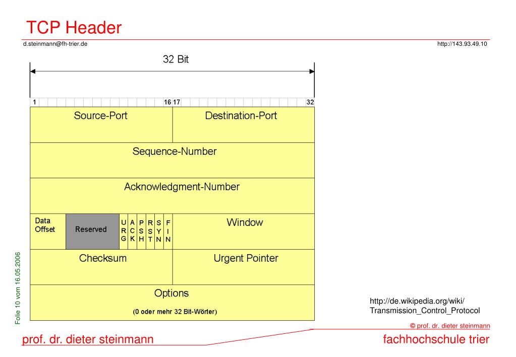 Felder des TCP Headers (wikipedia) • Source Port • Gibt die Portnummer auf der Senderseite an. • Destination Port • Gibt die Portnummer auf der Empfängerseite an. • Sequence Number • Sequenznummer des ersten Daten-Oktetts (Byte) dieses TCP-Paketes oder die Initialisierungs-Sequenznummer falls das SYN-Flag gesetzt ist. Nach der Datenübertragung dient sie zur Sortierung der TCP-Segmente, da diese in unterschiedlicher Reihenfolge beim Empfänger ankommen können. • Acknowledgment Number (Quittierungsnummer) • Sie gibt die Sequenznummer an, die der Sender dieses TCP-Segmentes als nächstes erwartet. Sie ist nur gültig, falls das ACK-Flag gesetzt ist. • Data Offset • Länge des TCP-Headers in 32-Bit-Blöcken – ohne die Nutzdaten (Payload). Hiermit wird die Startadresse der Nutzdaten angezeigt. • Reserved • Das Reserved-Feld wird nicht verwendet und muss null sein. • Window • Ist die Anzahl der Daten-Oktetts (Bytes), beginnend bei dem durch das Acknowledgmentfeld indizierten Daten-Oktett, die der Sender dieses TCP-Paketes bereit ist zu empfangen. • Checksum • Die Prüfsumme dient zur Erkennung von Übertragungsfehlern und wird über den Header und die Daten berechnet. • Urgent Pointer • Zusammen mit der Sequenz-Nummer gibt dieser Wert die genaue Position der Daten im Datenstrom an. Der Wert ist nur gültig, wenn das URG-Flag gesetzt ist. • Options • Das Options-Feld ist unterschiedlich groß und enthält Zusatzinformationen. Die Optionen müssen ein Vielfaches von 32 Bit lang sein. Sind sie das nicht, muss mit Null-Bits aufgefüllt werden (Padding). Dieses Feld ermöglicht, Verbindungsdaten auszuhandeln, die nicht im TCP-Header enthalten sind, wie zum Beispiel die Maximalgröße des Nutzdatenfeldes.