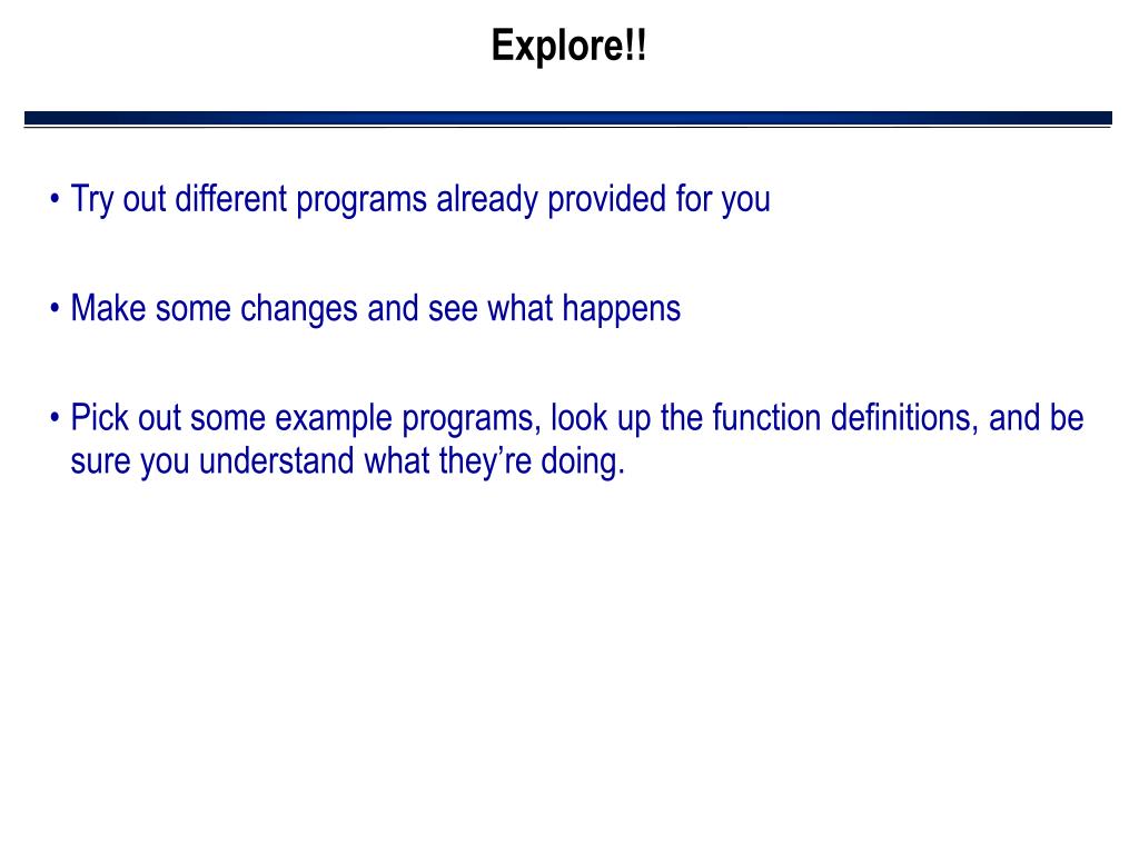 Explore!! • Try out different programs already provided for you • Make some changes and see what happens • Pick out some example programs, look up the function definitions, and be sure you understand what they’re doing.