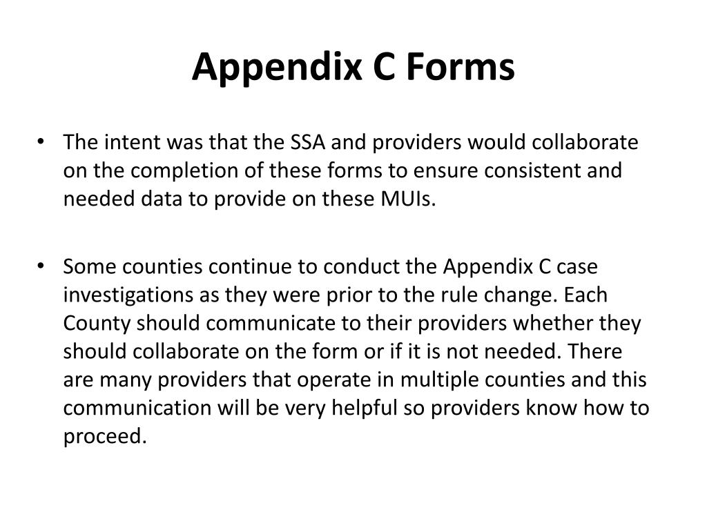 Appendix C Forms • The intent was that the SSA and providers would collaborate on the completion of these forms to ensure consistent and needed data to provide on these MUIs. • Some counties continue to conduct the Appendix C case investigations as they were prior to the rule change. Each County should communicate to their providers whether they should collaborate on the form or if it is not needed. There are many providers that operate in multiple counties and this communication will be very helpful so providers know how to proceed.