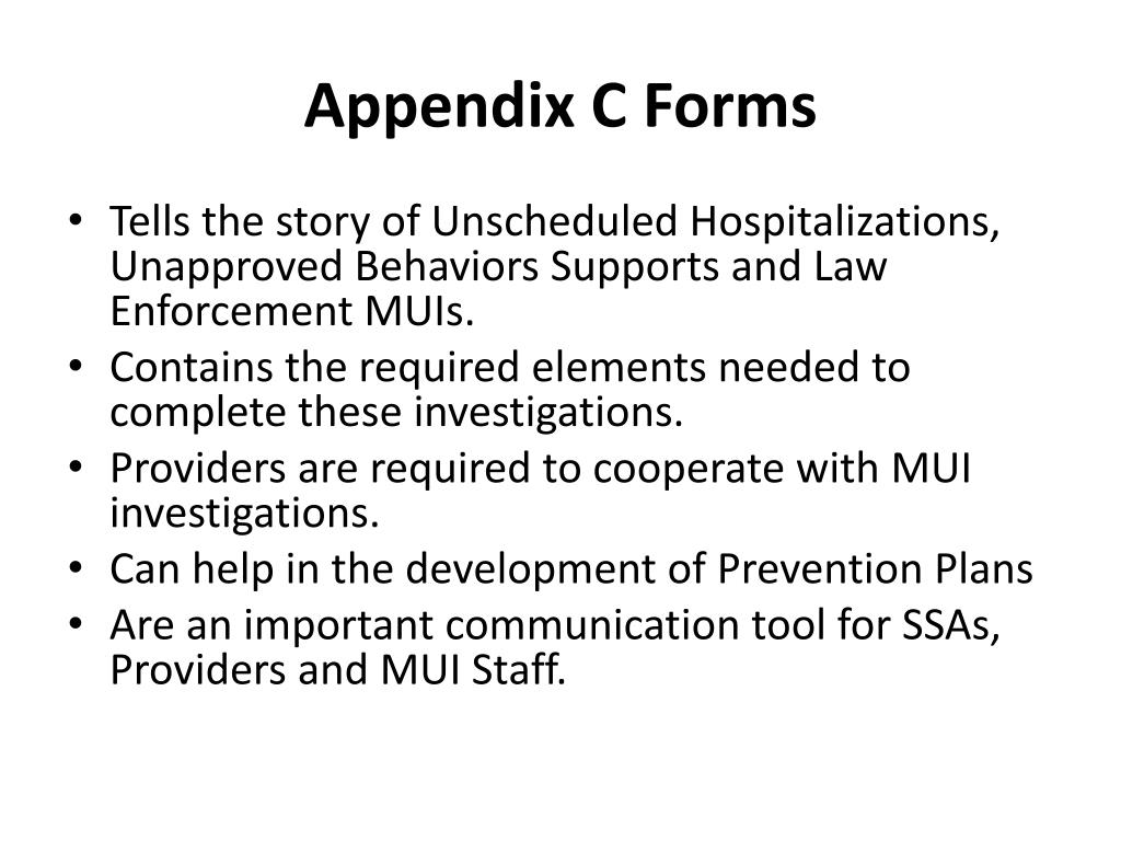 Appendix C Forms • Tells the story of Unscheduled Hospitalizations, Unapproved Behaviors Supports and Law Enforcement MUIs. • Contains the required elements needed to complete these investigations. • Providers are required to cooperate with MUI investigations. • Can help in the development of Prevention Plans • Are an important communication tool for SSAs, Providers and MUI Staff.