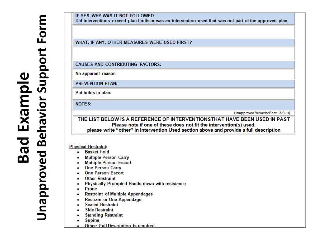 Describing the Intervention • The last page of the Unapproved Behavior Support Form includes a list of interventions that have been used. This is only a guide. • Please be sure to describe exactly what intervention(s) was used, even if it does not appear on this list. • This list is a reference and does not need to be sent to the County Board.