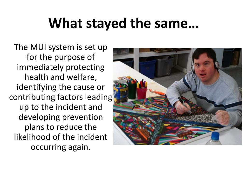 What stayed the same… The MUI system is set up for the purpose of immediately protecting health and welfare, identifying the cause or contributing factors leading up to the incident and developing prevention plans to reduce the likelihood of the incident occurring again.