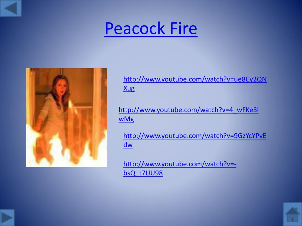 Peacock Fire http://www.youtube.com/watch?v=ue8Cy2QNXug http://www.youtube.com/watch?v=4_wFKe3lwMg http://www.youtube.com/watch?v=9GzYcYPvEdw http://www.youtube.com/watch?v=-bsQ_t7UU98