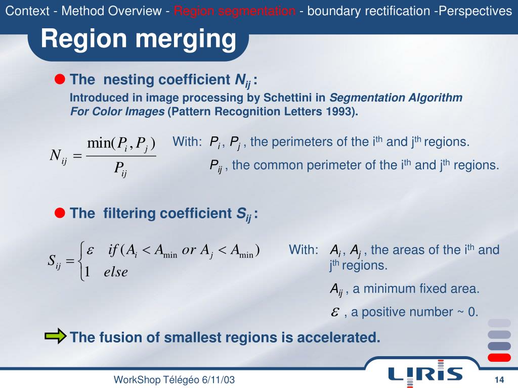 Context - Method Overview - Region segmentation - boundary rectification -Perspectives Region merging • The nesting coefficient Nij : Introduced in image processing by Schettini in Segmentation Algorithm For Color Images (Pattern Recognition Letters 1993). • The filtering coefficient Sij : The fusion of smallest regions is accelerated. With: Pi , Pj, the perimeters of the ith and jth regions. Pij, the common perimeter of the ith and jth regions. With: Ai , Aj, the areas of the ith and jth regions. Aij, a minimum fixed area. , a positive number ~ 0. WorkShop Télégéo 6/11/03