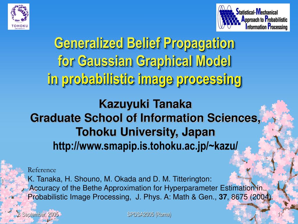 Generalized Belief Propagation for Gaussian Graphical Model in probabilistic image processing. Kazuyuki Tanaka Graduate School of Information Sciences, Tohoku University, Japan http://www.smapip.is.tohoku.ac.jp/~kazu/. Reference K. Tanaka, H. Shouno, M. Okada and D. M. Titterington: