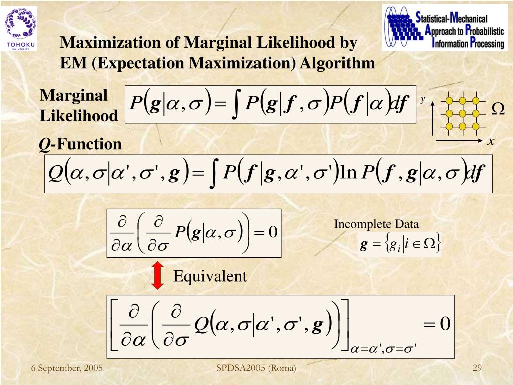 Marginal Likelihood Maximization of Marginal Likelihood by EM (Expectation Maximization) Algorithm Q-Function Incomplete Data Equivalent SPDSA2005 (Roma)