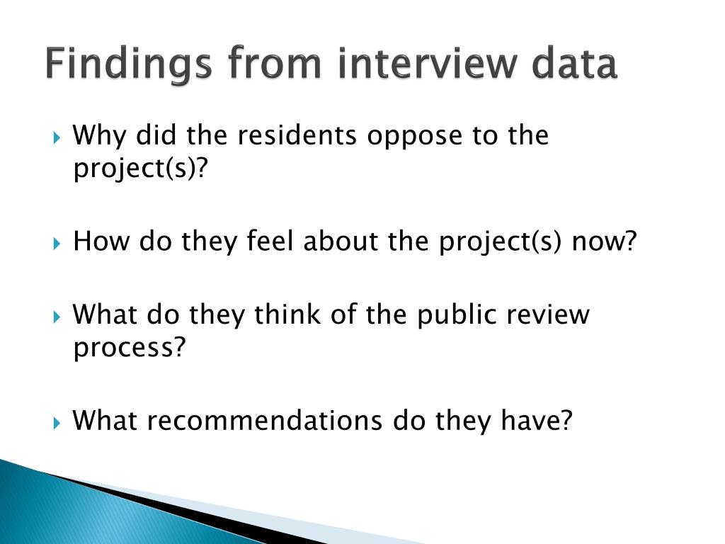 Findings from interview data • Why did the residents oppose to the project(s)? • How do they feel about the project(s) now? • What do they think of the public review process? • What recommendations do they have?