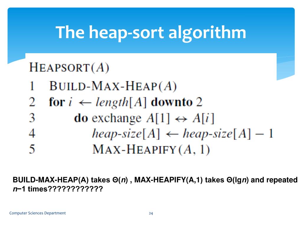 The heap-sort algorithm BUILD-MAX-HEAP(A) takes Θ(n) , MAX-HEAPIFY(A,1) takes Θ(lgn) and repeated n−1 times???????????? Computer Sciences Department