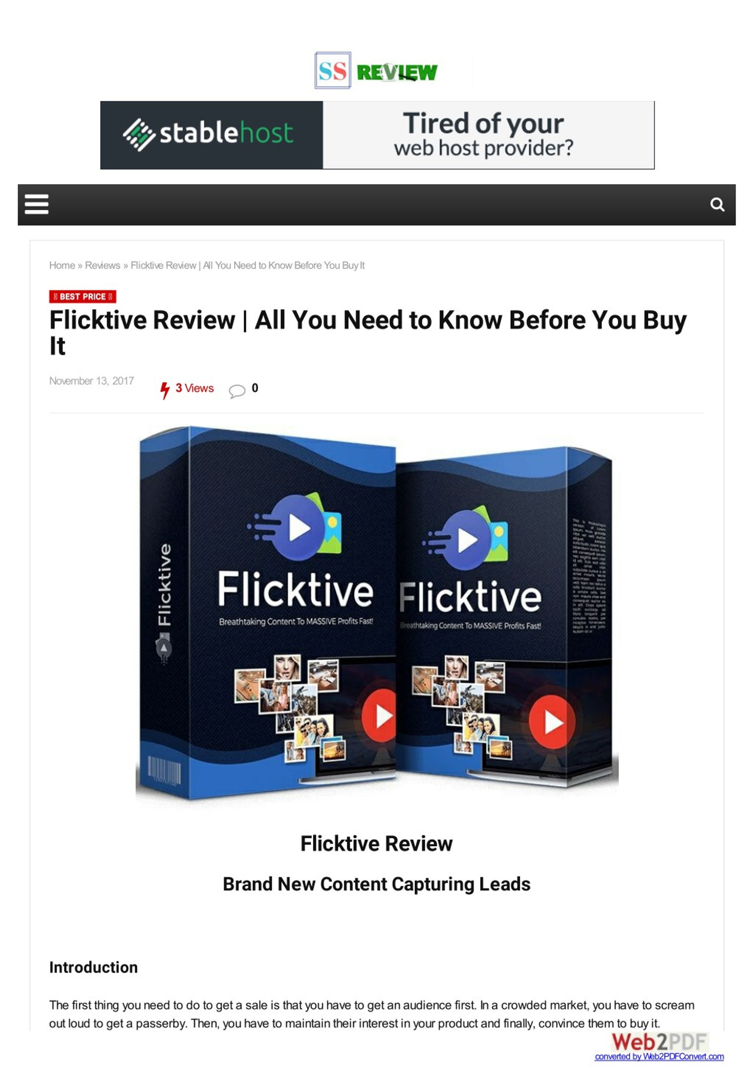 Home » Reviews » Flicktive Review | All You Need to Know Before You Buy It ? ? BEST PRICE BEST PRICE ? ? Flicktive Review | All You Need to Know Before You Buy It November 13, 2017 3 Views 0 Flicktive Review Brand New Content Capturing Leads Introduction The first thing you need to do to get a sale is that you have to get an audience first. In a crowded market, you have to scream out loud to get a passerby. Then, you have to maintain their interest in your product and finally, convince them to buy it. converted by Web2PDFConvert.com