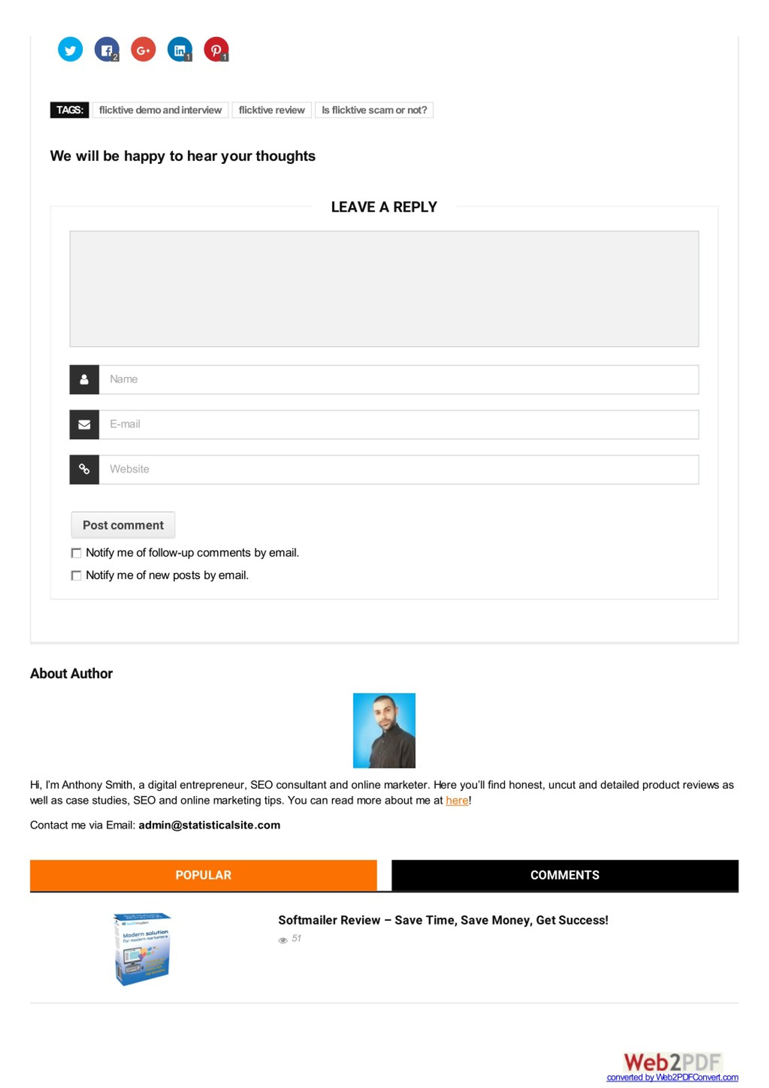 2 1 1 TAGS: flicktive demo and interview flicktive review Is flicktive scam or not? We will be happy to hear your thoughts LEAVE A REPLY Name E-mail Website Post comment Notify me of follow-up comments by email. Notify me of new posts by email. About Author Hi, I’m Anthony Smith, a digital entrepreneur, SEO consultant and online marketer. Here you’ll find honest, uncut and detailed product reviews as well as case studies, SEO and online marketing tips. You can read more about me at here! Contact me via Email: admin@statisticalsite.com POPULAR COMMENTS Softmailer Review – Save Time, Save Money, Get Success! 51 converted by Web2PDFConvert.com