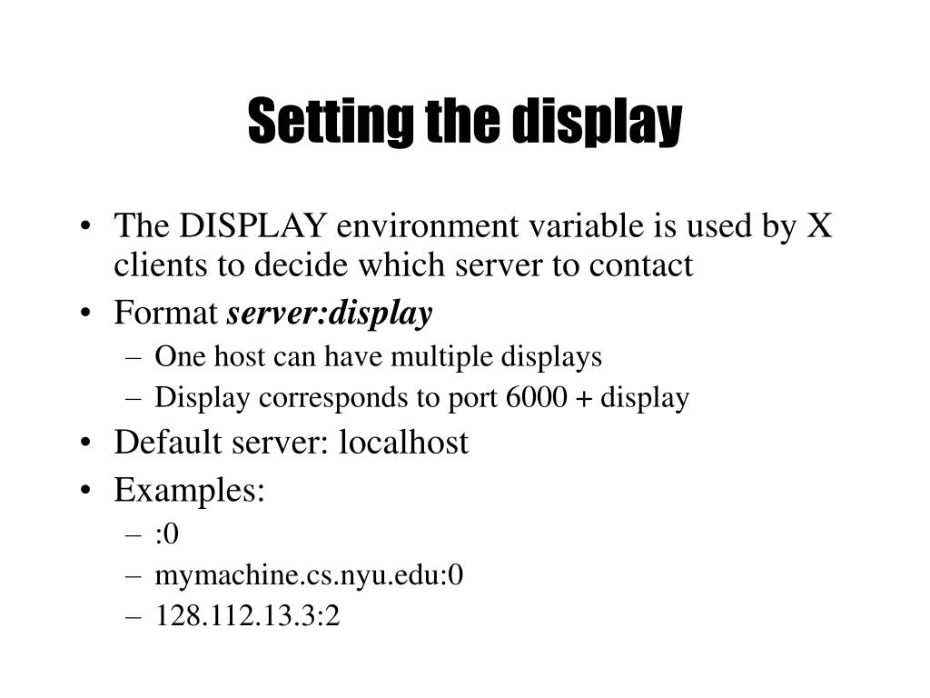 Setting the display • The DISPLAY environment variable is used by X clients to decide which server to contact • Format server:display • One host can have multiple displays • Display corresponds to port 6000 + display • Default server: localhost • Examples: • :0 • mymachine.cs.nyu.edu:0 • 128.112.13.3:2