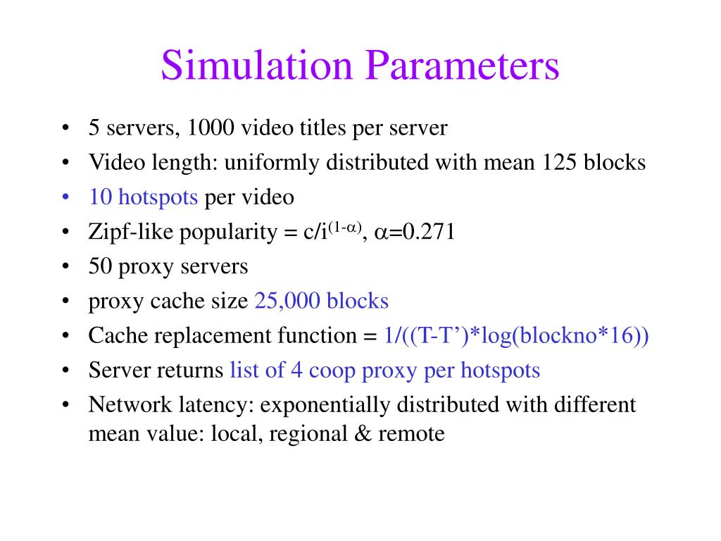 Simulation Parameters • 5 servers, 1000 video titles per server • Video length: uniformly distributed with mean 125 blocks • 10 hotspots per video • Zipf-like popularity = c/i(1-), =0.271 • 50 proxy servers • proxy cache size 25,000 blocks • Cache replacement function = 1/((T-T’)*log(blockno*16)) • Server returns list of4 coop proxy per hotspots • Network latency: exponentially distributed with different mean value: local, regional & remote