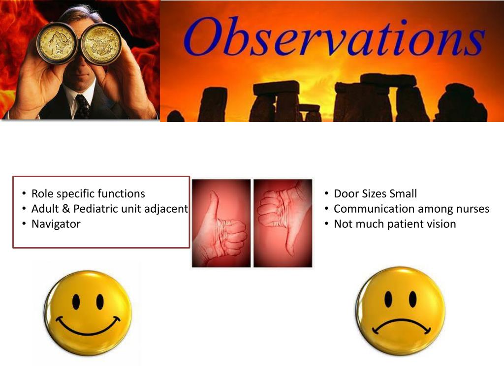 Role specific functions • Planned treatment • Adult & Pediatric unit adjacent • Navigator • Door Sizes Small • Communication among nurses • Not much patient vision