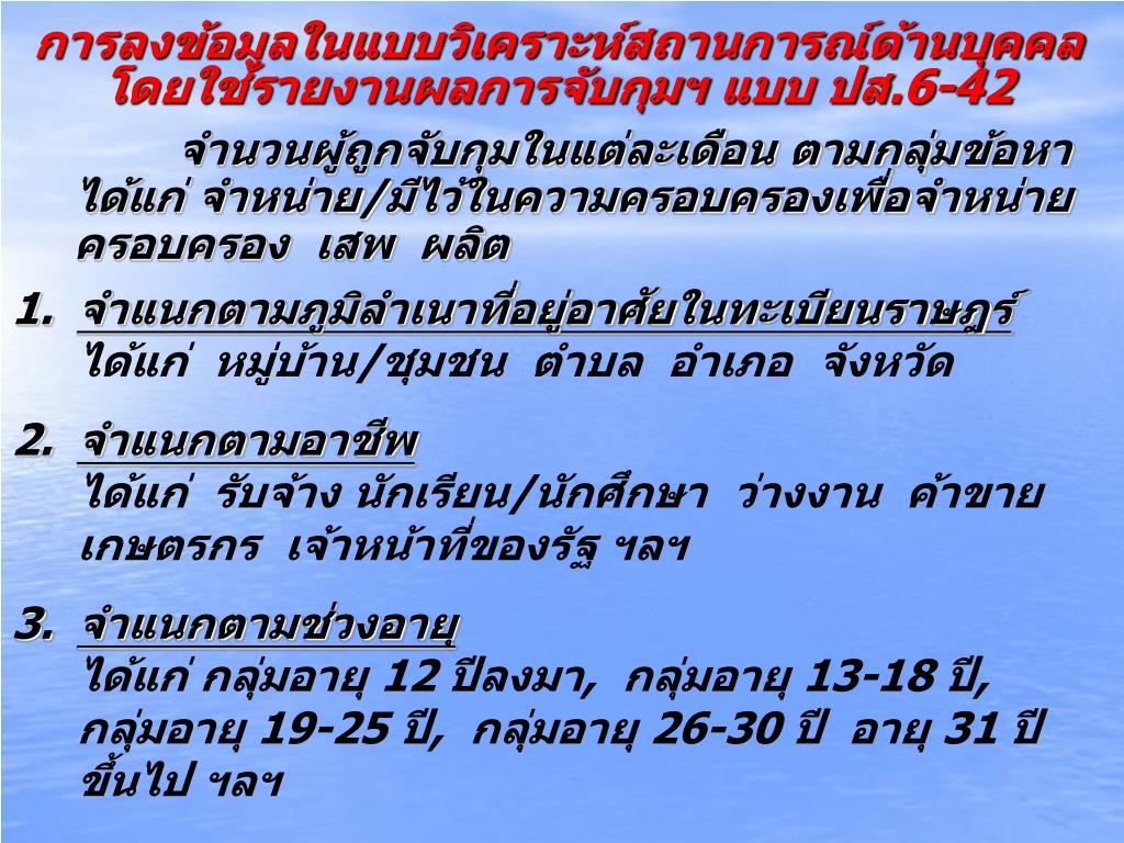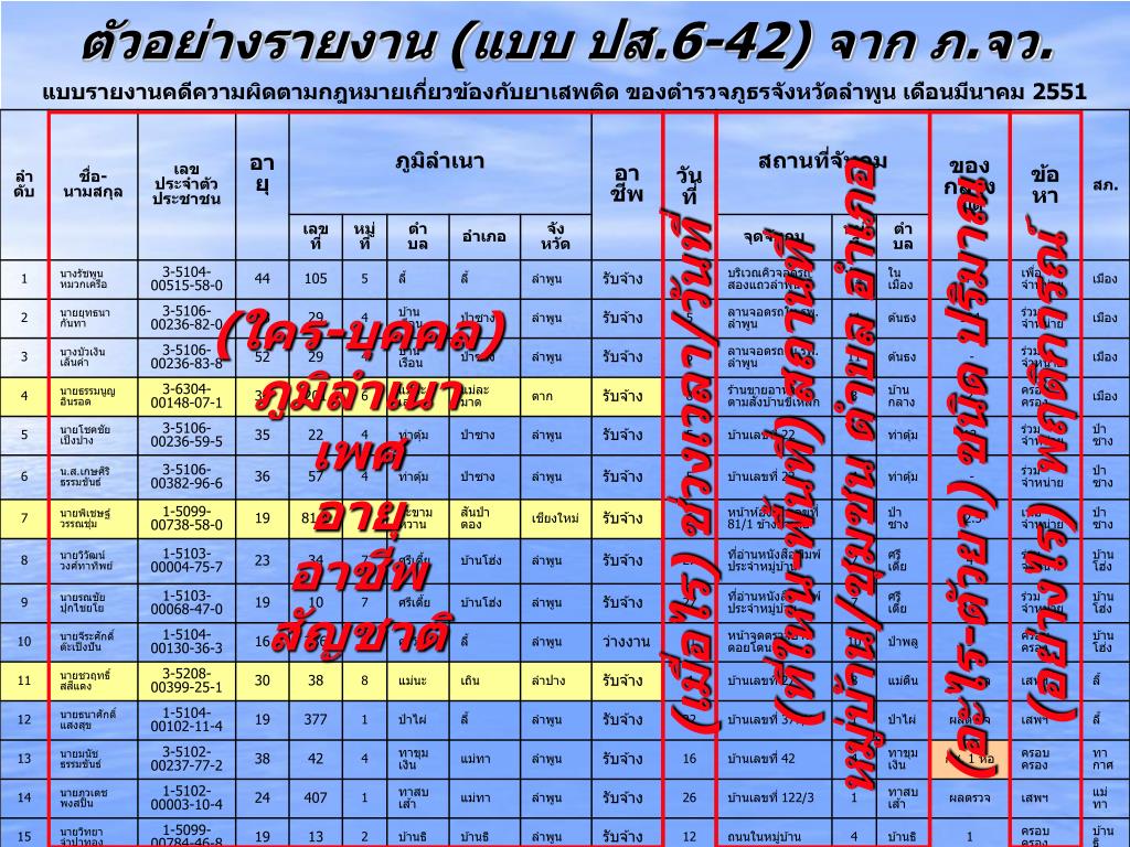 ตัวอย่างรายงาน (แบบ ปส.6-42) จาก ภ.จว. (ใคร-บุคคล) ภูมิลำเนา เพศ อายุ อาชีพ สัญชาติ (ที่ใหน-พื้นที่) สถานที่ หมู่บ้าน/ชุมชน ตำบล อำเภอ (อะไร-ตัวยา) ชนิด ปริมาณ (อย่างไร) พฤติการณ์ (เมื่อไร) ช่วงเวลา/วันที่